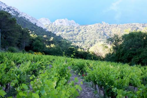 ブドウ畑は「La Fouille」と「Les Florets」の地区にあり、「La Fouille」は泥灰石灰岩、「Les Florets」は粘土質の土壌です。ブドウ品種はグルナッシュ50%、シラー50%。標高350mの高地のジゴンダスらしいもの。樹齢の平均は40年です。低い畑と比べると収穫も遅くなります。また、この高地の畑は近年に取得したものです。生産本数は年間4000本ほどですから1ヘクタール弱の面積だと思います。それと畑で特徴的なのは割と密植している点です。ちょっと見1ヘクタールあたり4∼5000本植樹しているようです。通常のジゴンダスでは1500∼2000本ですので異例。調べると畑の脇を小川が流れているそうです。それゆえ土壌に保水力があるようです。特殊な良い畑のようですね(笑)。ご本人達も購入したことを良かったと思っています(笑)。